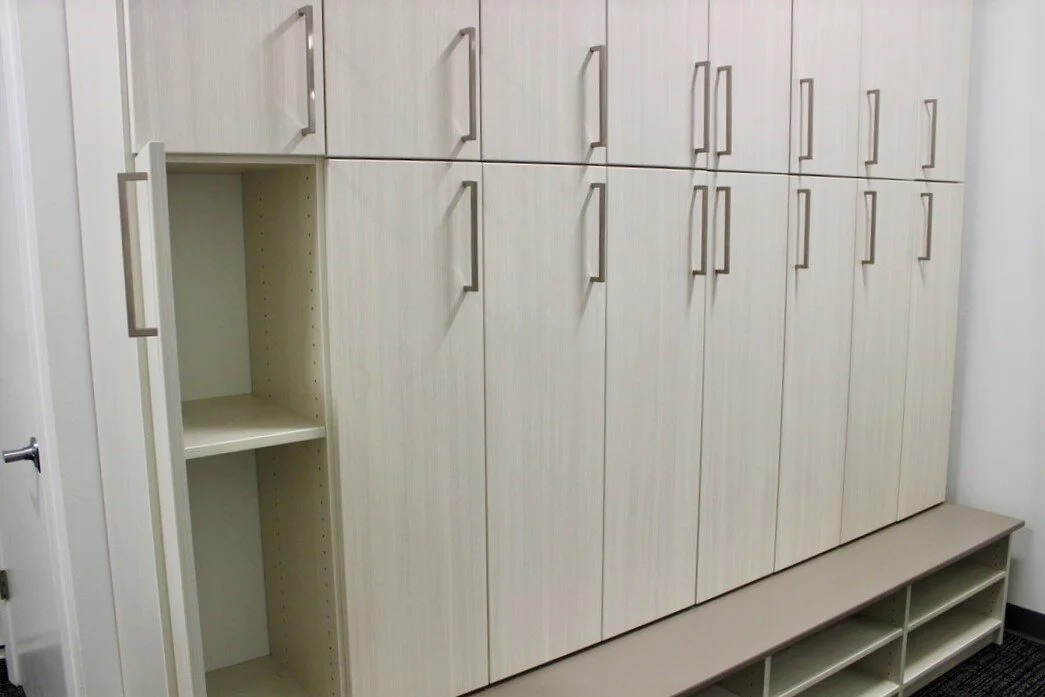 The Stow Company designed and installed four custom storage solutions - from our staff storage lockers in our entryway, to our hallway closet, to our cleaning closet, to a shelf system in our staff lounge.